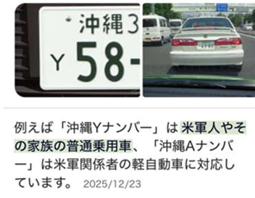 TOP > ブログ > Yナンバー Yナンバー 2026年2月12日 ブログ / 世間話 沖縄で運転していたらYナンバーの車をみかけました。調べてみたらアメリカ軍の人たちのナンバーなんですね。運転席には外国の方がのっていました。基地もたくさんあるし、沖縄は独特な雰囲気があると思います。 残波岬 back